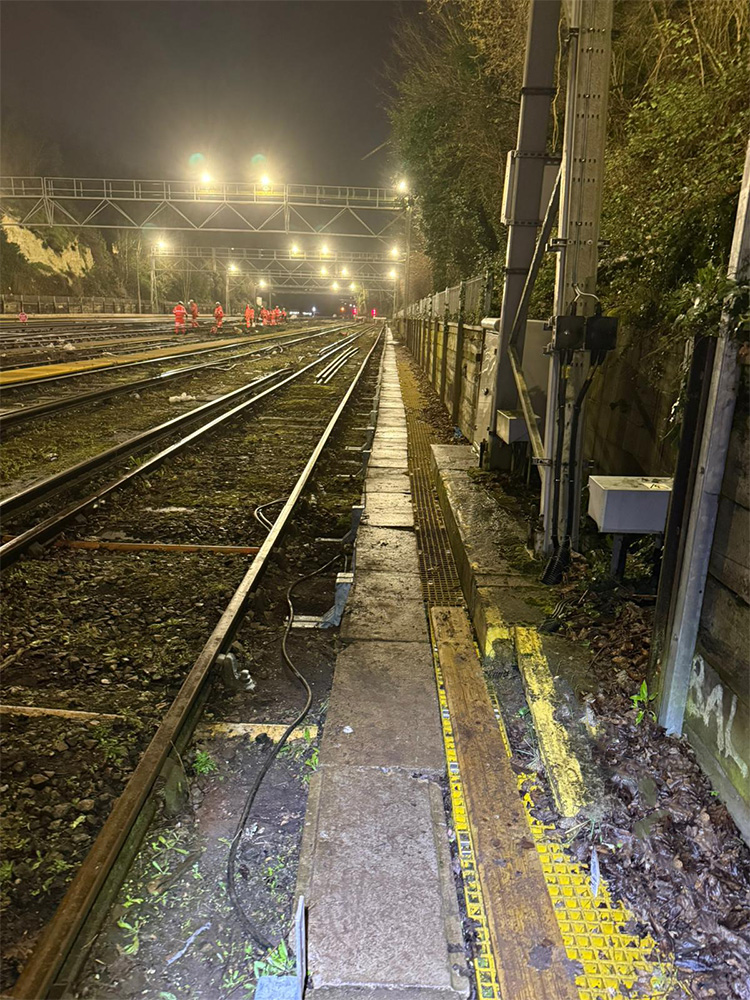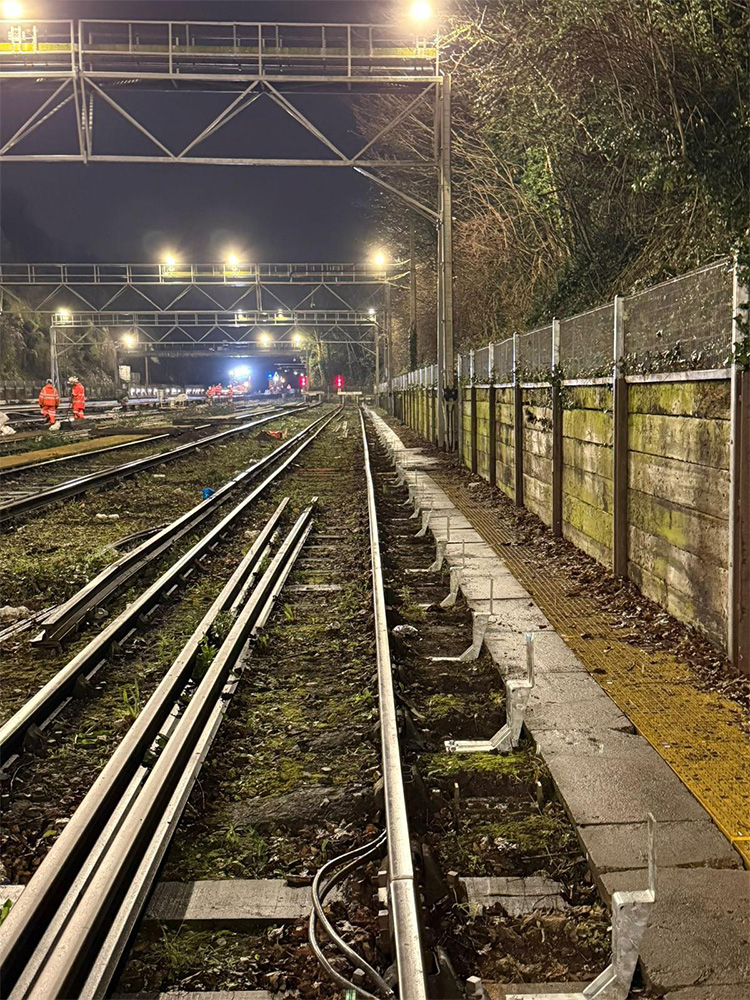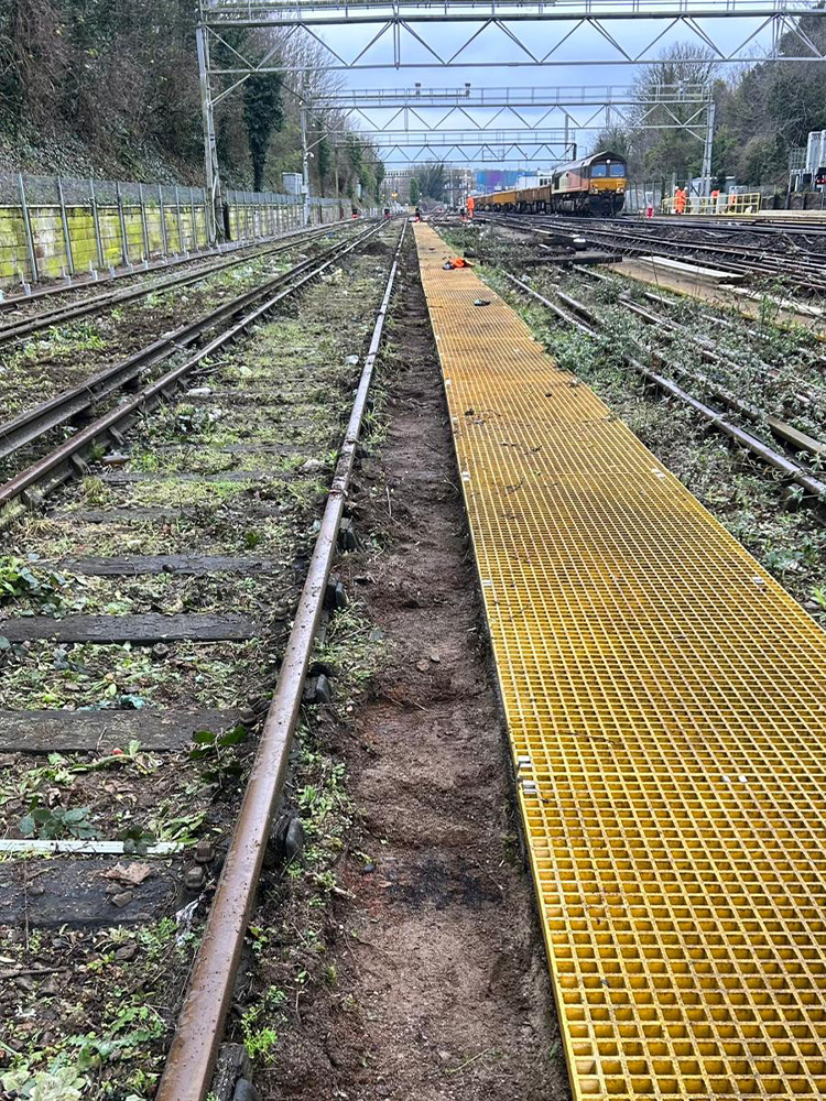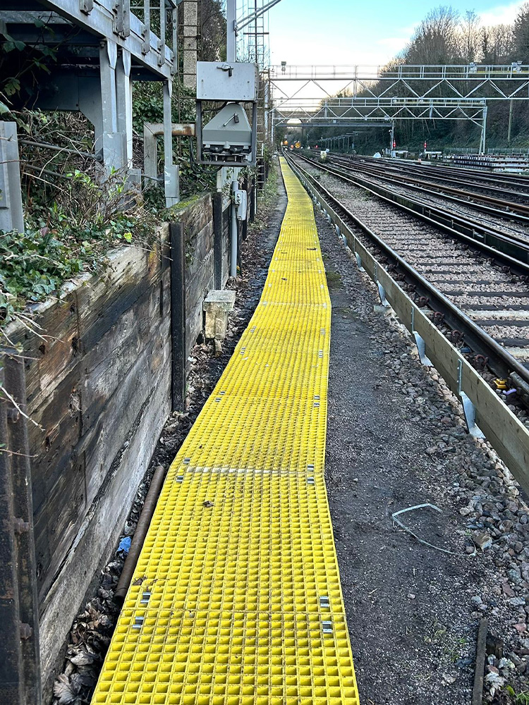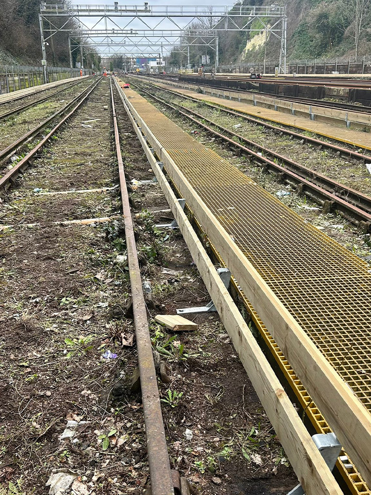 The scope of works included the loading, installation, and securing of approximately 1,200 metres of GRP walkway, together with all associated fixings and handrails. The project also involved the installation of guard boarding alongside the conductor rail to enhance safety and compliance.
